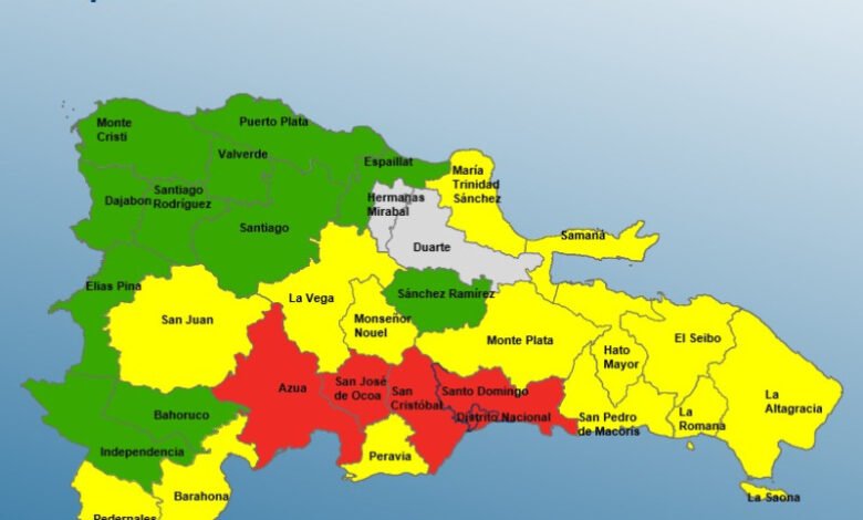 Mientras que en alerta verde figuran: Elías Piña, Puerto Plata, Montecristi, Dajabón, Santiago Rodríguez, Independencia, Sánchez Ramírez, Santiago, Bahoruco, Espaillat y Valverde.