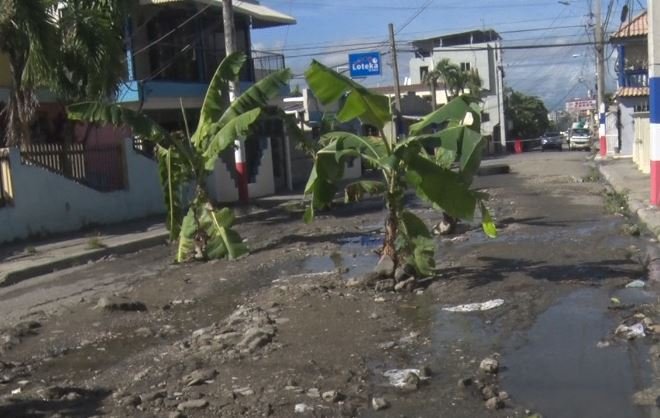 SAN FRANCISCO DE MACORÍS. – Residentes del sector Hermanas Mirabal realizaron una peculiar protesta al sembrar una mata de plátano en plena calle José Reyes, en reclamo por el deterioro de la vía ocasionado por una avería de agua que, según denunciaron, no ha sido reparada por el Instituto Nacional de Aguas Potables y Alcantarillados (INAPA).
